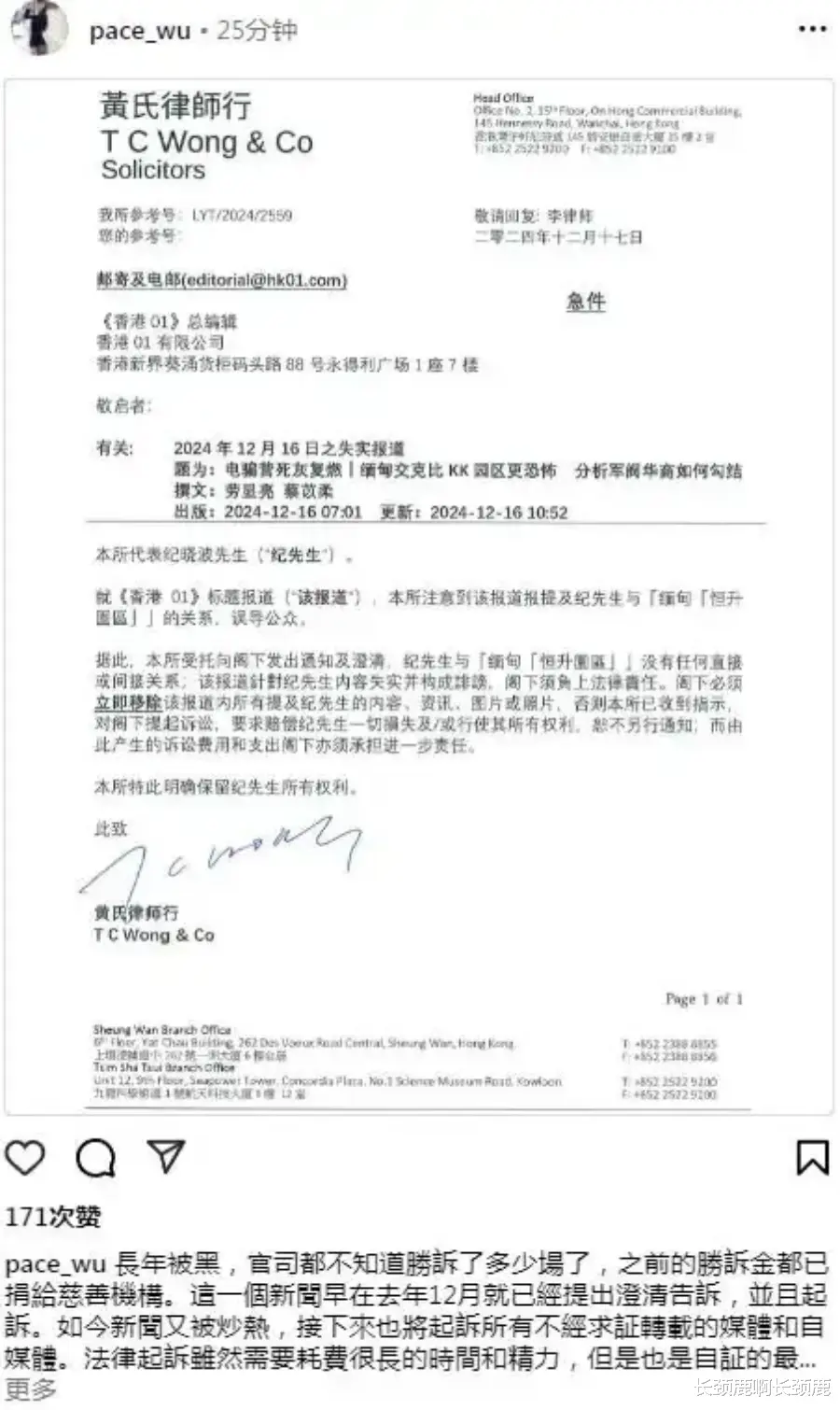 刚刚发布辟谣纪晓波没有被通缉的声明没过一个月,纪晓波又被港媒揭露是缅甸园区的幕后老板。吴佩慈这次又要起诉港媒。