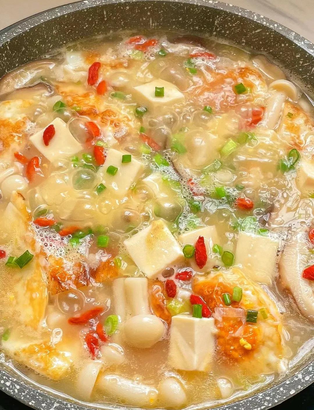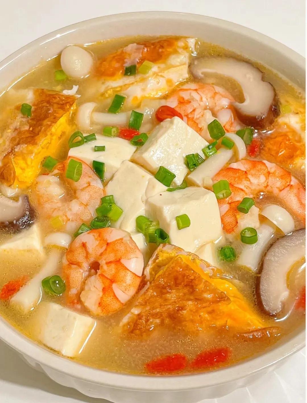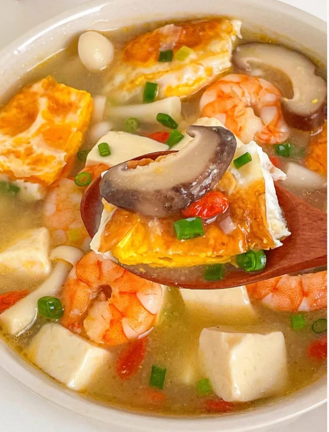 分享《三鲜菌菇汤》的做法,材料和步骤 材料: 豆腐200g 香菇50g 鸡蛋1个 虾仁50g 高汤500ml 盐适量 葱花适量 生姜适量 步骤: 1. 豆腐先放入清水中焯一下,捞起放入碗中备用。 2. 香菇切片,虾仁冲洗干净备用。 3. 锅中放入适量的高汤(或清水),加入适量的姜片和葱段,加入适量的料酒和生抽,烧开后放入香菇和虾仁煮约3分钟。 4. 打入鸡蛋,用筷子轻轻划动,让鸡蛋形成丝状,煮约1分钟。 5. 最后放入豆腐,加入适量的盐,煮约1分钟即可。 6. 饭前再稍稍加一点油,再开煲一下即可上桌享用。 温馨提示: 1. 虾仁加入煮的时候,煮过头会有点老,大约3分钟左右即可。 2. 姜片和葱段用来去腥味,提香味,放入时切片切段可随意调整。 3. 盐,高汤和清水可以自行根据口感调整。