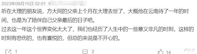曾有网友质疑高原环境对气胸患者并不友好,可方大同还是选择在云南久住,据说这与他父亲在 2023 年于云南大理去世有关,或许他想在那里陪伴父亲,寻找内心的慰藉。不过,这些终究只是网友们的猜测,他离世的真正原因,随着他的离去,已成为永远的谜团。