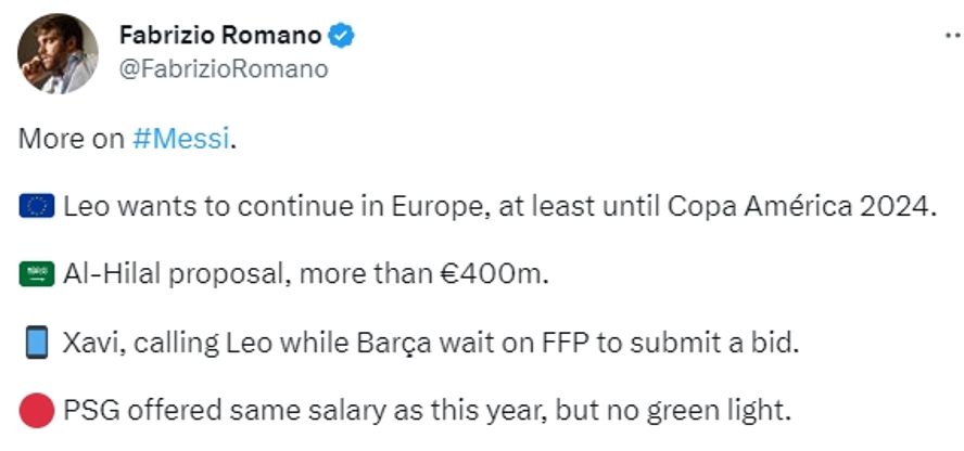 梅西收4亿欧年薪报价!哈维给他打电话,巴萨要竞争? 近日,关于梅西的未来,出现了很多变数。据名记罗马诺透露,大巴黎并没有像传闻中希望梅西降薪,不过他依然没有答应续约。本赛季,梅西多次听到大巴黎球迷的嘘声,他可能已经心灰意冷了。 与此同时,利雅得新月给梅西送上了4亿欧年薪的合同,这将打破C罗创造的纪录(2亿欧年薪),不过梅西的首选,依然是回到巴萨。 据悉,哈维已经给梅西打了电话,等巴萨通过财政方面的审查,就会送上报价,与其他球队竞争梅西。 如果回到巴萨,梅西的收入肯定会下降,这家西甲豪门如今面临很大的财政困难。不过梅西肯定不会介意,他对巴萨的感情不能用金钱来衡量,只要有机会,梅西就会不顾一切回去,这一切都是因为爱!