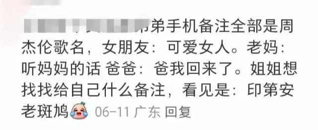 我妈给我备注:大宝贝 我妹备注:二宝 给我弟备注:无语 ,因为他从小比较犟,不知道现在改了没有