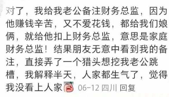 总的来说,夫妻之间那些离谱的备注,看似只是一种简单的社交标识,实则蕴含着丰富的情感和生活智慧。它们从最初的情趣逐渐演变成了生活中的乐趣,成为了夫妻之间独特的情感纽带。这些备注不仅记录了他们的爱情故事,也让我们看到了现代婚姻生活的多姿多彩。所以,当我们看到那些让人忍俊不禁的夫妻备注时,不妨为这份独特的爱情和生活的智慧点赞。
