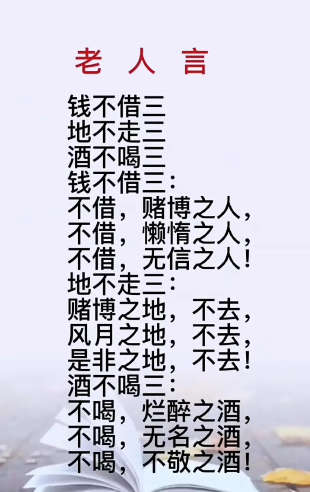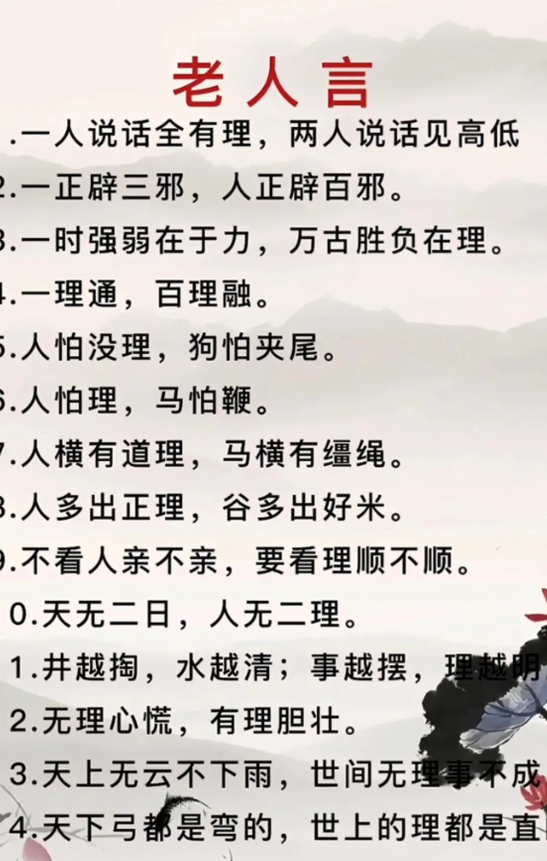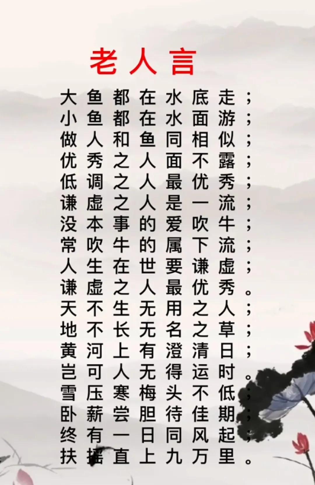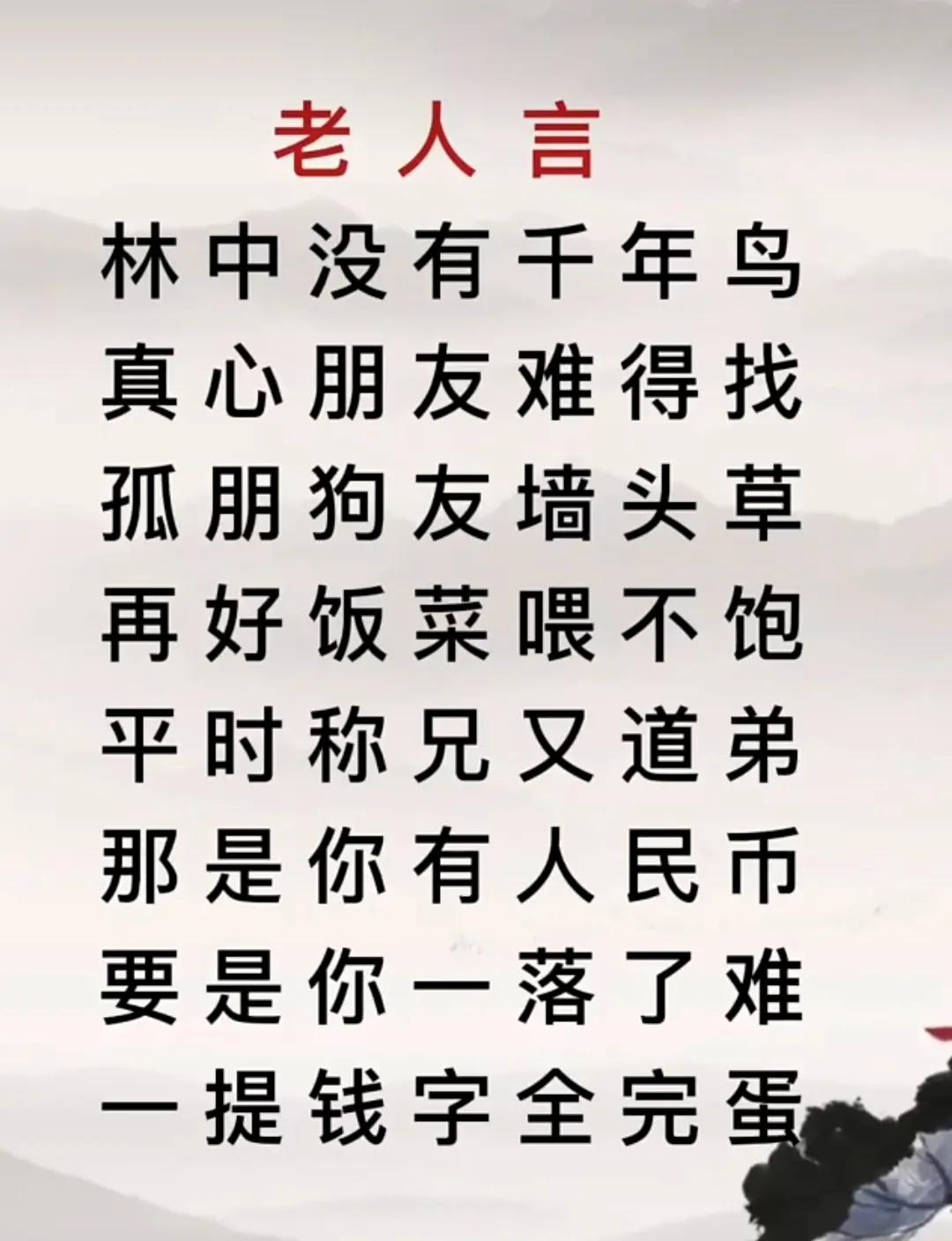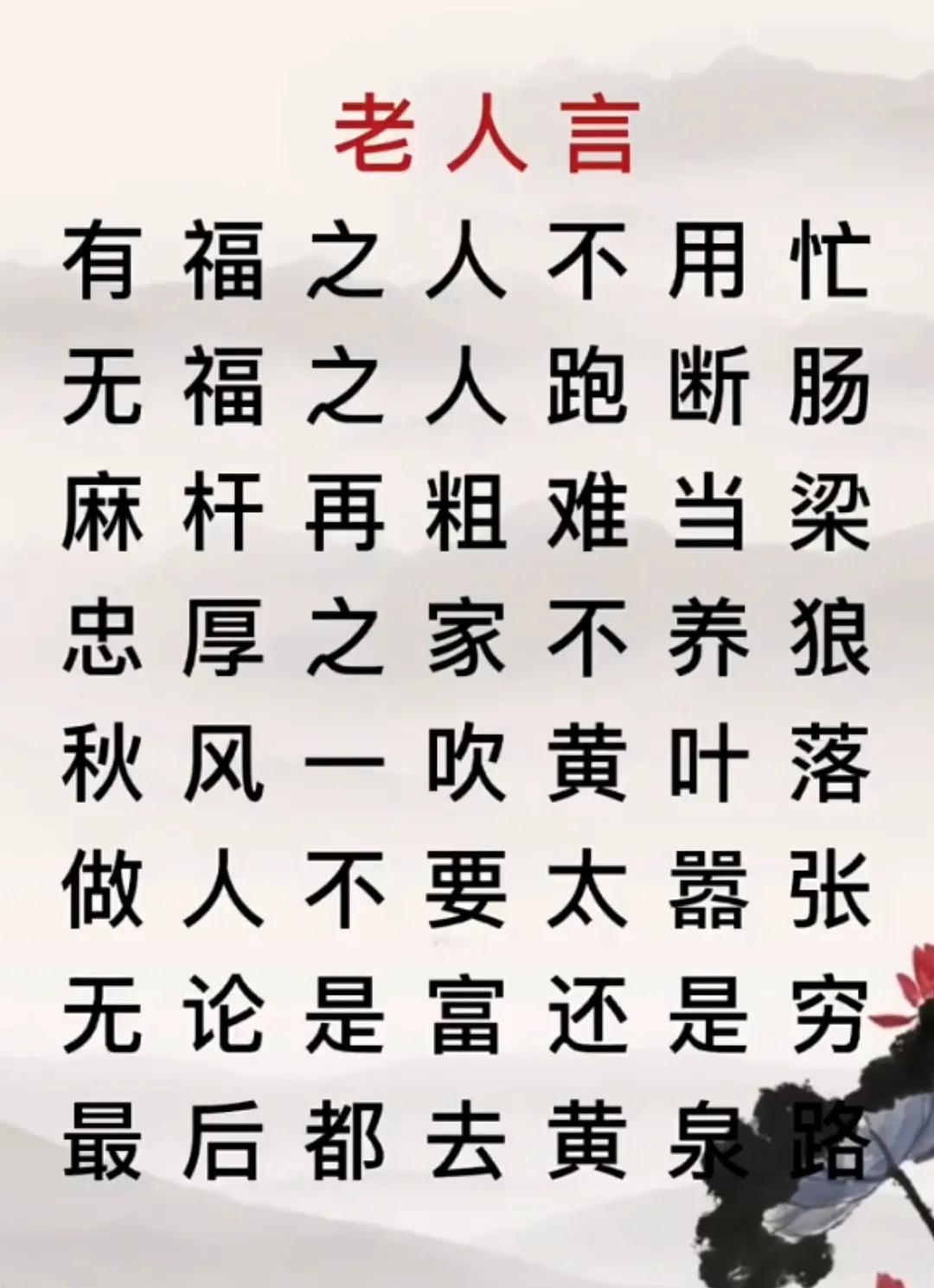 太精辟了,经典的老人言:句句都是大实话,句句都是大道理,常言道:花无百日红,人无一世穷打人不打脸,骂人不揭短 路遥知马力,日久见人心。读懂真实受益一生,起发颇多!