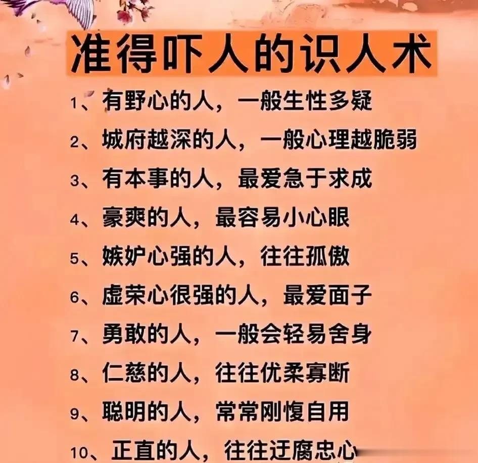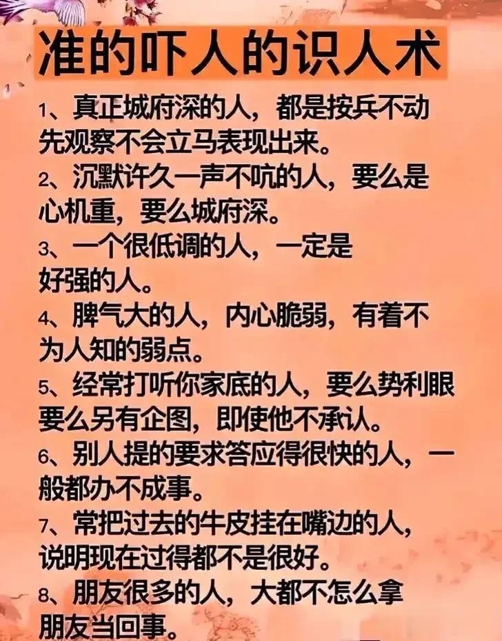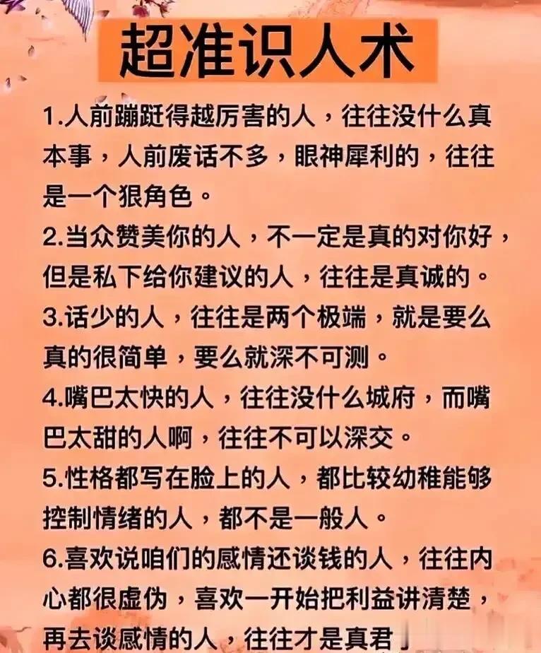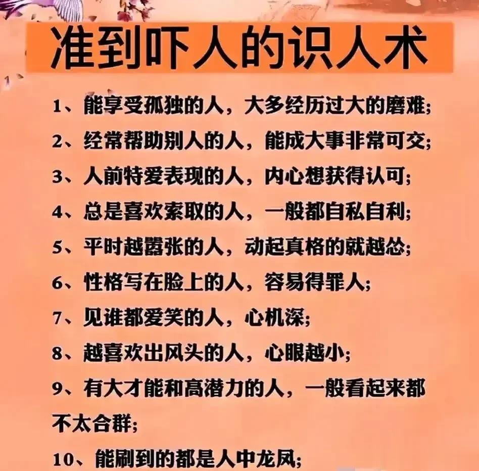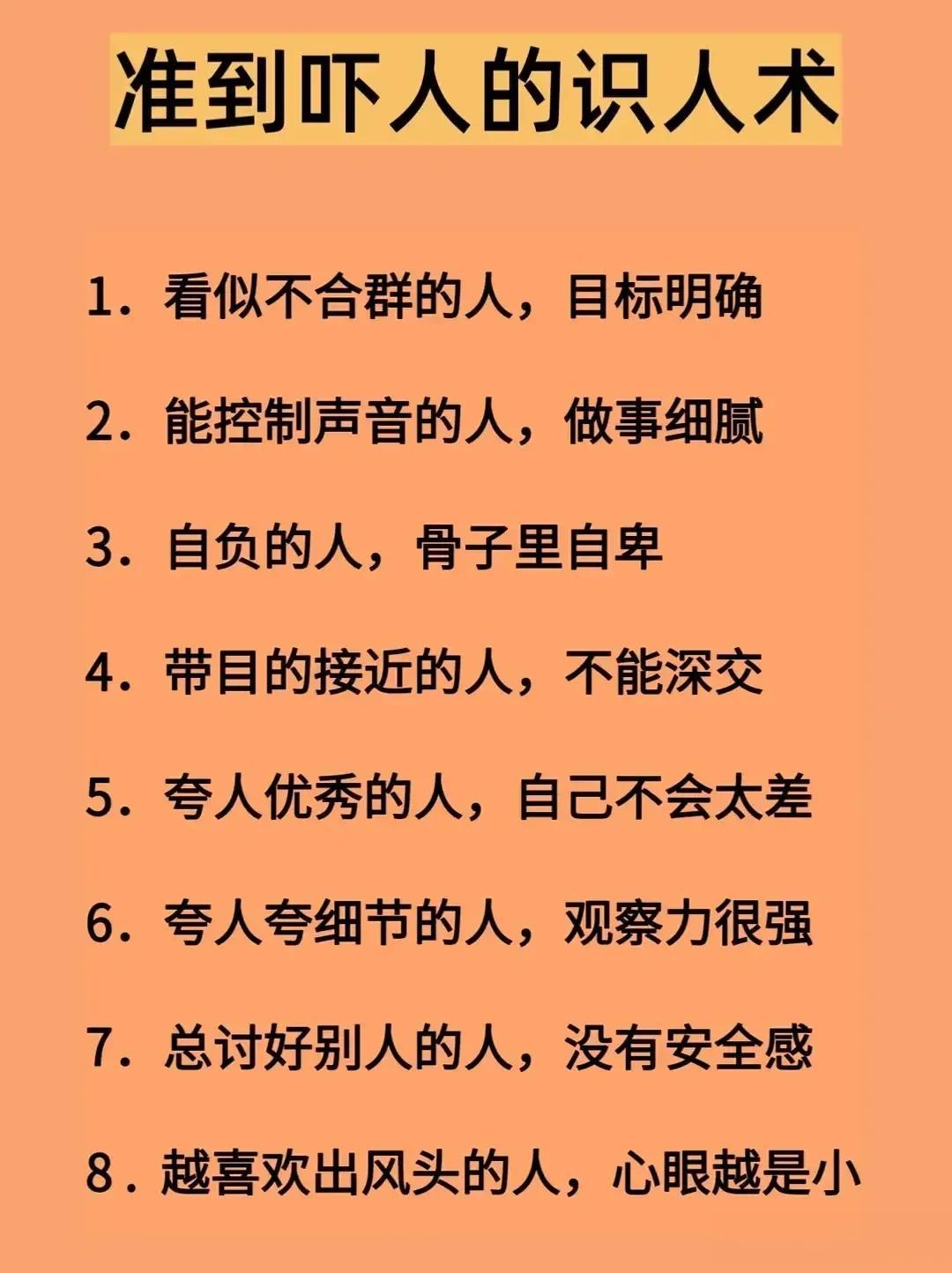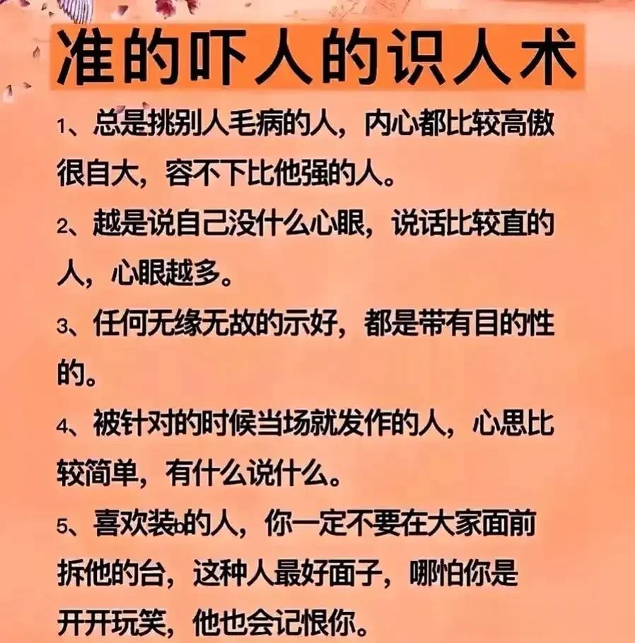 天呐!准到吓人的识人术,嘴巴甜的人尽量不要深交,经常诉苦的人也不要深交,见面熟的人一般不值得信赖!真是太有道理,太精辟,太经典了!