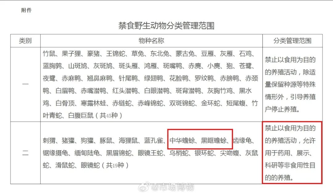 中华蟾蜍是三有保护动物,有批量养殖,但在2020年《禁食野生动物分类管理范围》里,归入第二类:禁止以食用为目的的养殖活动,允许用于药用、展示、科研等非食用性目的的养殖。这就是为什么蠄蟝有得吃,但相对少的原因。