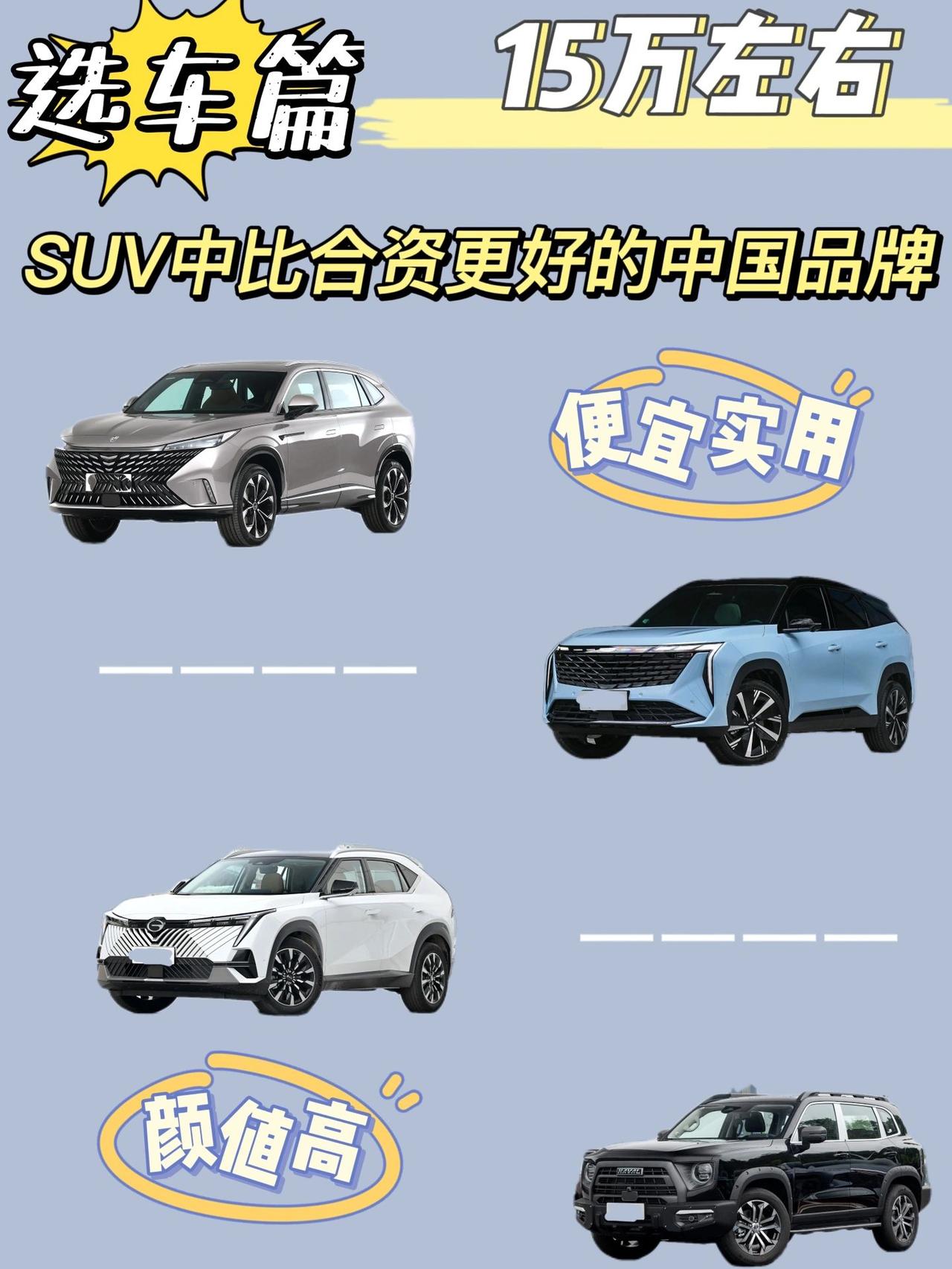 15万左右SUV中比合资车更好的中国品牌! 想要一个紧凑型的SUV,颜值还高,是考虑合资还是国产品牌呢。想花15万左右,这个价格范围内,我觉得国产的性价比很高。我们就说说这四款车。 荣威RX5 荣威RX5这款车型已经更新到第三代了,外观也是比较升级很多。更加的时尚的。前脸的进气格栅尺寸也是比较的大,内饰方面,设计师为了迎合当下的需求,让内饰看起来不是那么的呆板,采用了一块27英寸的可滑移屏幕作为中控屏,提升了很多档次。后排的空间也是比较的大。乘坐也是比较舒服的。1.5T的涡轮增压发动机,插电式混合动力也是比较不错的。所以综合实力还是比较强的。 广汽传祺影酷 影酷是全新的紧凑型SUV,主打年轻动感与科技智能,与影豹有这类似的设计风格。目前影酷有1.5T2.0T和2.0L的排量。给我们的选择也是非常多的。内饰方面也是采用了联屏的设计,独立的全液晶仪表盘和14.6英寸的触摸屏幕组成。这款的性价比也是很高的。 吉利博越L 从博越到博越L这款车无论是产品还是实力,也是提升了很大的一个档次。同时也提供了1.5T 2.0T和1.5TD雷神HI.F混合动力的给大家选择。这点还是人性化的。紧凑型的SUV相比。他有些非常大的进气格栅很有辨识度。同时内饰方面也是有些不错的科技感。加入了光幕的设计元素。会根据你的心情。或者驾驶模式或者音乐来变化。比较推荐的是1.5T的版本。平时代步用已经够用了。 哈弗大狗 在这四台车中,哈弗大狗算是最个性的车型了,有些硬派SUV的外观风格,同时也有这不错的四驱能力他也提供了1.5T和2.0T两种动力组合。2.0T也是主销四驱版本。底盘还是比较扎实的。