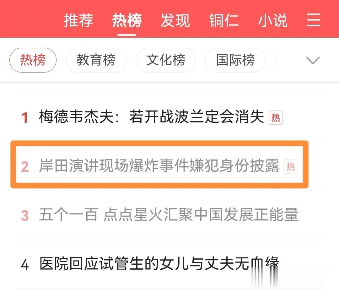 头条热榜:岸田演讲现场爆炸事件嫌犯身份披露 近日,一场重要的岸田演讲现场爆炸事件震动了整个国家。经过警方的缜密侦查,终于揭开了这起爆炸事件的嫌犯身份。 嫌犯名叫李某,现年36岁,是一名从事化学工作的专业技术人员。警方通过对爆炸现场的勘察、监控录像的分析以及证人证言的收集,最终确认了李某的身份。 原来,在岸田演讲现场,李某放置了一部自制炸弹,导致现场爆炸。这次爆炸事件造成了多人死伤,给整个社会带来了沉重的打击。 警方在抓捕嫌犯时,李某并没有反抗,他向警方交代了自己的犯罪事实,并表示自己是出于对政府的不满而犯下这些罪行的。李某的居所也被警方搜查,出土了大量他制作炸弹的材料和工具等物品。 这起爆炸事件引起了全国范围内的关注和讨论,许多人都对行凶者的动机感到不理解。法律界专家也指出,对于类似的犯罪行为,法律应该严格打击,同时也应该加强对恐怖主义的防范和打击力度,以维护社会的安全与稳定。 总之,这起岸田演讲现场爆炸事件的发生,给人们敲响了警钟,让我们更加明确地认识到,珍惜和平与安宁的重要性,并且要共同努力,维护社会的和谐稳定。