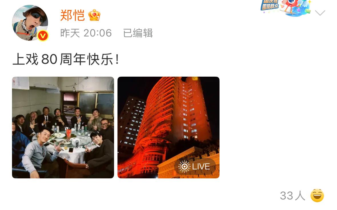 除了徐峥之外,郑恺也在个人社交账号中分享与同学一起聚餐庆祝“上戏”80周年校庆的画面,他们十几个人前去一家“苍蝇小馆”聚会,特别接地气。