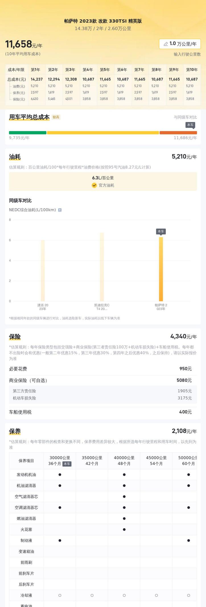 按照每年行驶2万公里计算,一年的油费大约在13185元左右。保险费用大约为4668元/年,保养费用大约为2608元/年。总的来说,一年的用车成本大约在20461元左右,对于一辆B级车来说,这个用车成本还算合理。