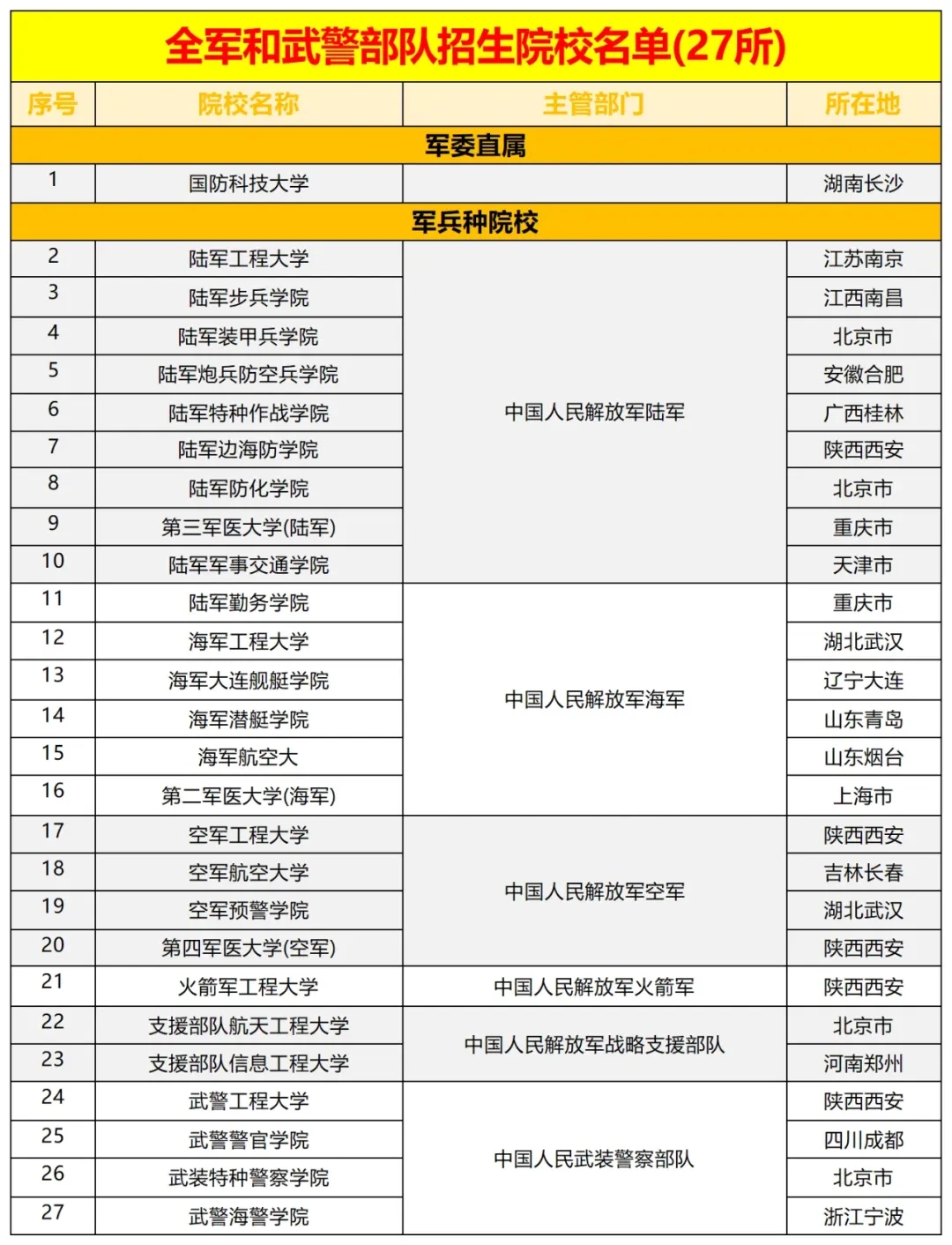 四、附:军校、警校、定向士官院校招生名单,仅供参考