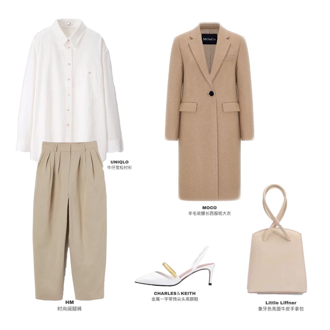 这是一套同色系的穿搭,足够温柔和谐,怕单调无趣,所以用一个造型较为独特的包。