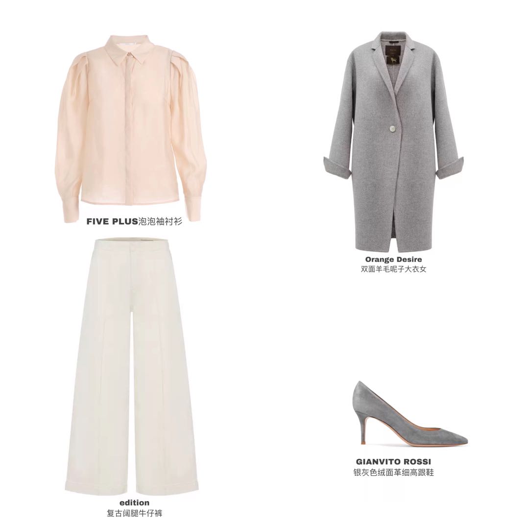 羊毛大衣向来常见于法式穿搭中,虽是灰色却不显拘谨,高跟鞋与大衣同色。稍带粉色的内衬是这一套搭配的别致温柔。