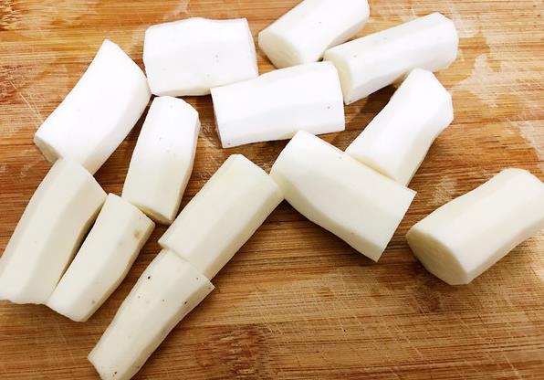 3、两根山药,分别削掉外皮,冲掉杂质,剁成5公分左右的小段。其切开后容易发黑,我们先浸没在清水中存放。