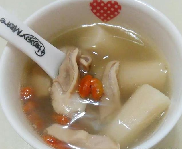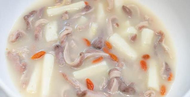 5、接着将其倒入砂锅中,放葱段以及姜片,半锅热水倒进去,开火加热,保持小火咕嘟一个半钟头。将山药倒进去,继续咕嘟半个小时,山药也炖透。最后可以加点枸杞,补些盐搅匀,就可以盛入碗中享用了。