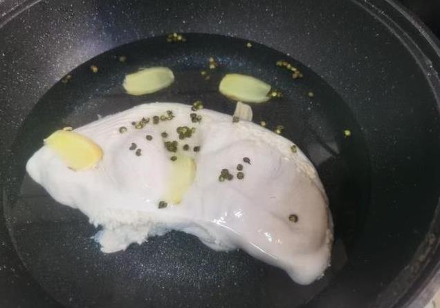 1、按照以上方式将其仔细地清理干净,之后放到锅里,多加些水,搭配一些姜片和花椒来煮。开锅之后析出浮沫,继续煮一会儿,不再增加时就代表煮透了,将其捞出来,重新用温水冲干净。