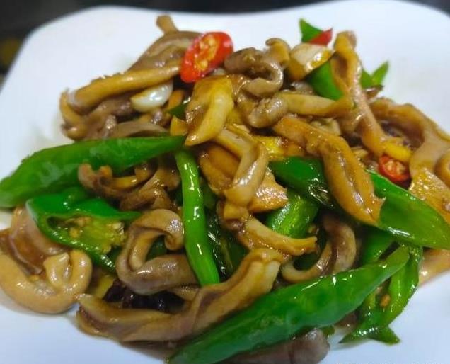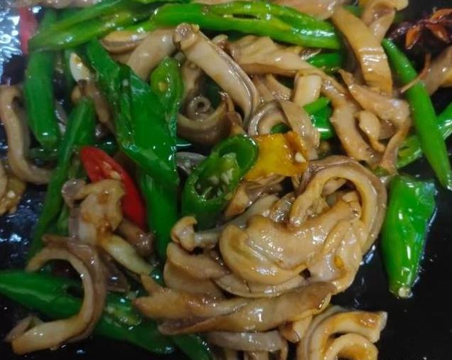4、接着多准备一些青红椒洗净切好,丢进去,补一点生抽,蚝油,盐,继续快速翻炒,让各种香味都裹到猪肚上,即可出锅。吃起来又脆又香,开胃又下饭。