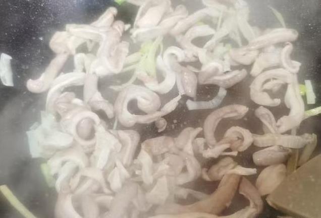 4、锅里淋一点油,充分热透,将猪肚放进去,加葱姜,料酒一起大火炒,这样可以进一步烹出其中的异味,炒一分钟左右即可。