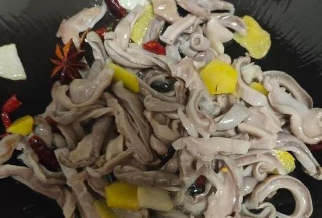 3、锅里放油和葱姜八角爆香,把肚丝倒进去,继续用大火炒,反复炒透,烘出香味来。