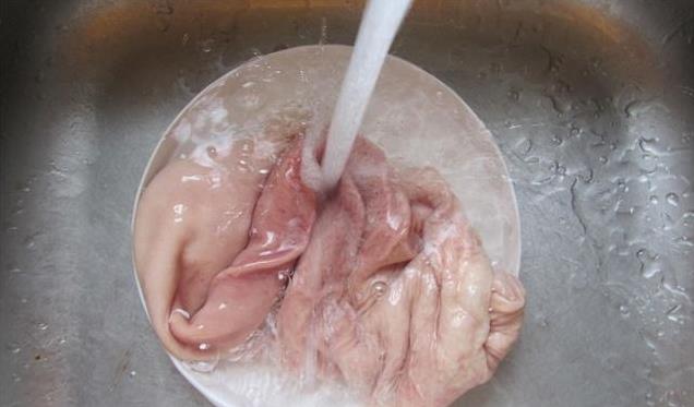 1、其为一个中空的结构,其内部含有很多的黏液,杂质等,浓重的味道也主要是来源于这里。而相比之下,外部就简单了不少。我们首先用厨房剪刀剪边缘的油脂,肥肉修剪掉。接着用温水来冲洗外部,并且搓一搓。