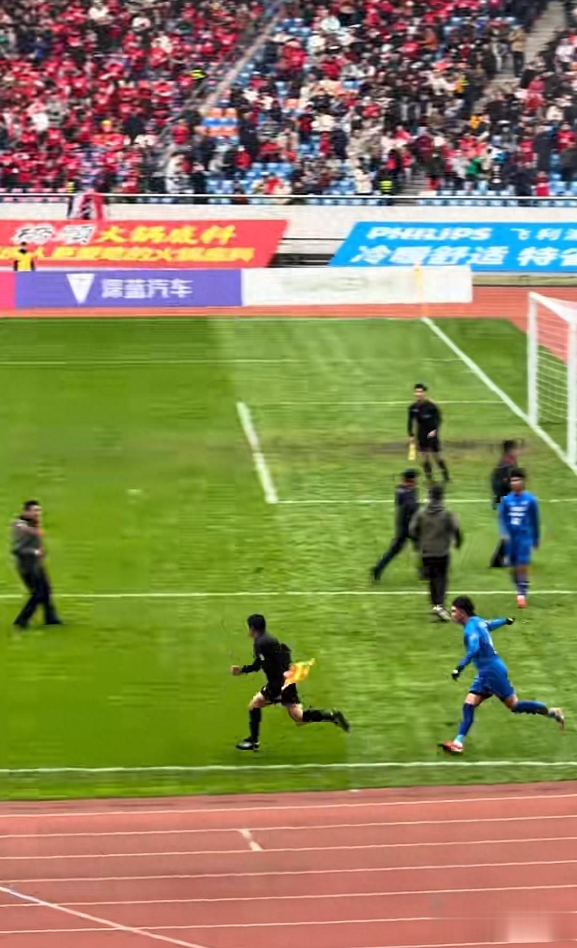 根据现场爆出的多段视频显示,在比赛进入尾声的关键时刻,大渡口进球被裁判"吹掉"之后,有球员因不满判罚,随后球场竟然出现了“追赶边裁”的极端行为,所幸边裁跑得非常快,及时与追赶球员拉开距离,避免了冲突进一步加剧。
