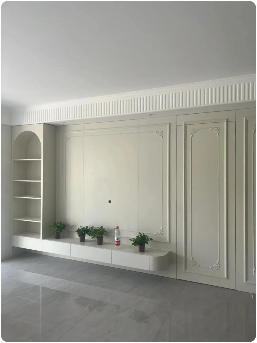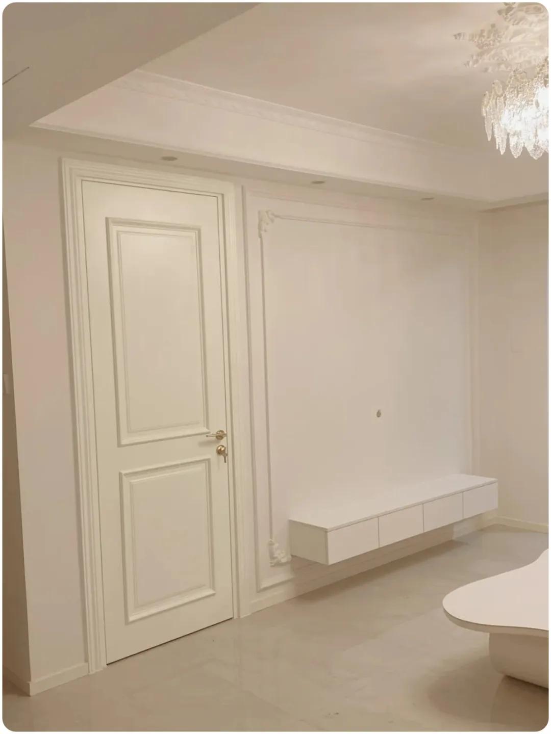 ▲定制客厅背景墙,使用和墙壁相同的颜色的乳胶漆,勾勒出背景线条,隐藏门上制作石膏线造型,使沙发背景成为一个完整的背景,进一步放大空间视觉。