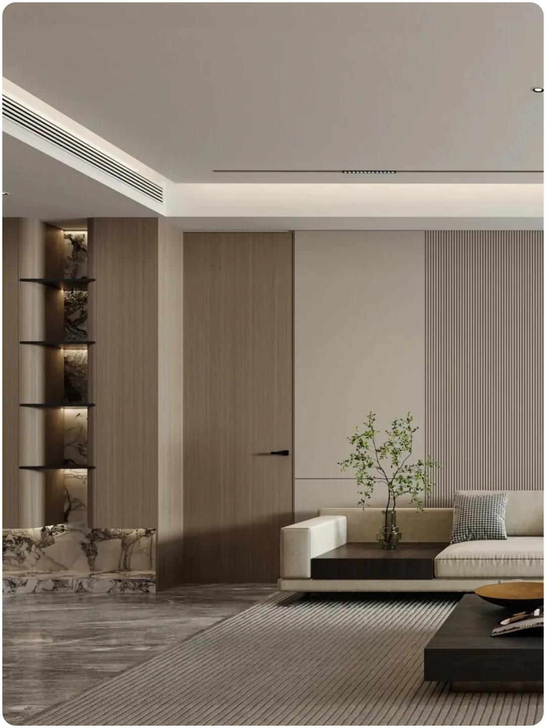 ▲为了避免沙发背景墙上的门显得突兀,采用了格栅隐形门的设计,不仅可以放大视觉空间,能解决背后有单独门的突兀问题。