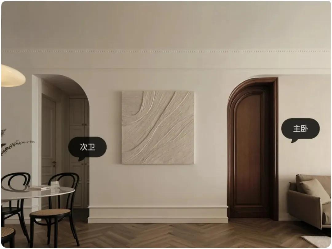 ▲主卧和次卫在同一平面上,次卫的垭口采用单侧弧形设计,主卧门则为镜像的半弧形,形成对称之美,令人眼前一亮。