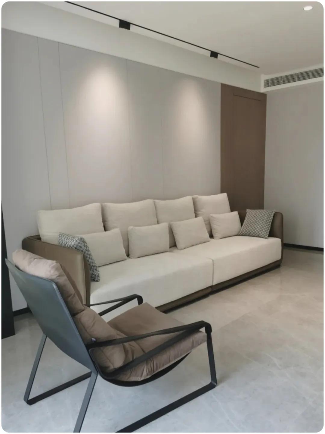 ▲为了让沙发背景墙看起来更统一,选择隐形门。隐形门选择了木饰面一体式,整体效果简洁大方,不落俗套,效果非常好。