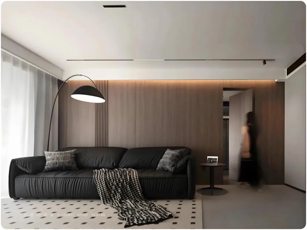 ▲电视背景墙与隐形门的一体化设计,平时看不出来,木质饰面形成的一个整体元素,不仅提升了整体性,而且空间感被放大。
