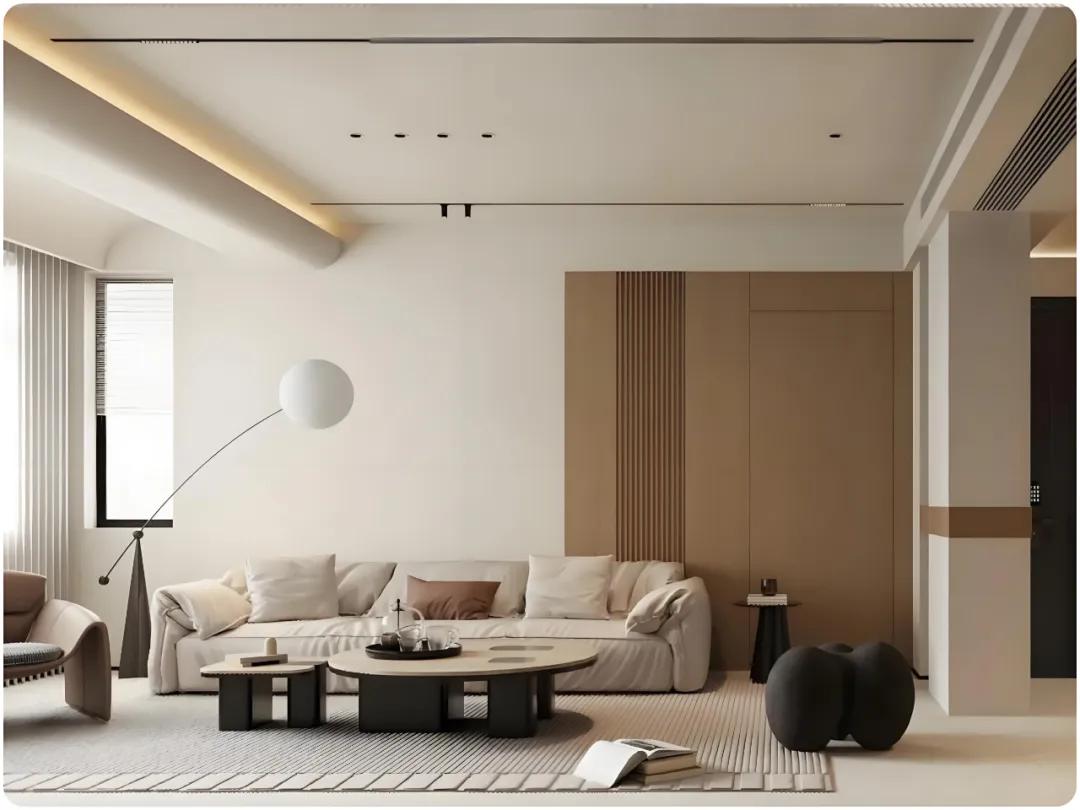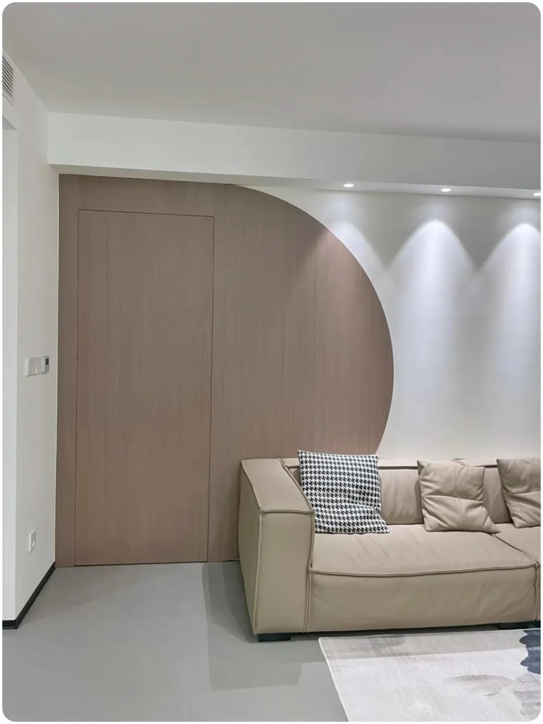 ▲沙发背景墙隐形门设计,用油漆与木饰面连接,木饰面采取半圆形的形状,可以降低门洞的突兀感,使得沙发背景简单大气。