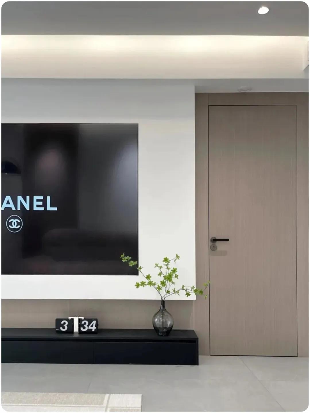 ▲电视背景墙有门,考虑到预算有限,采用了外平内开的假隐形门的做法,完美解决了双包套门凹进去的问题,实现与墙面的齐平,整体效果简洁大方。