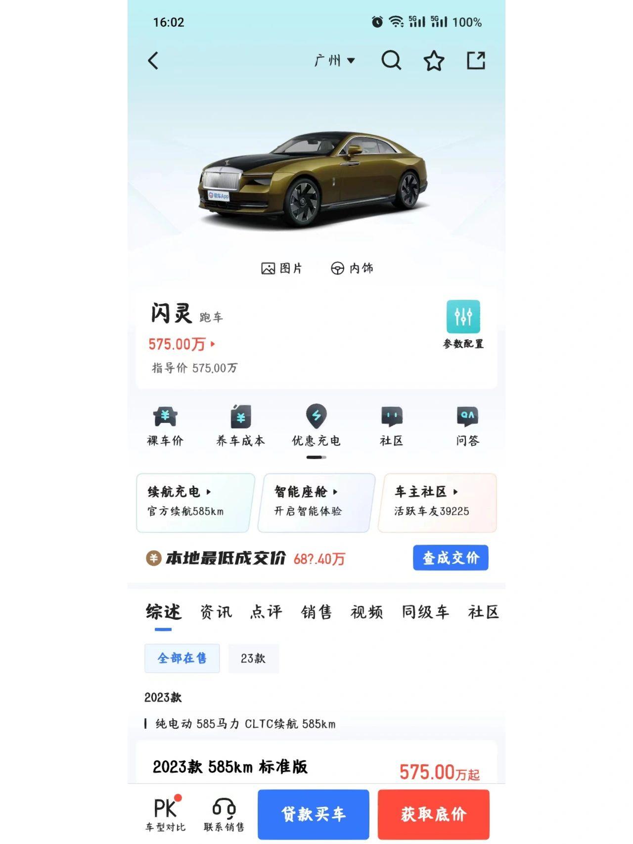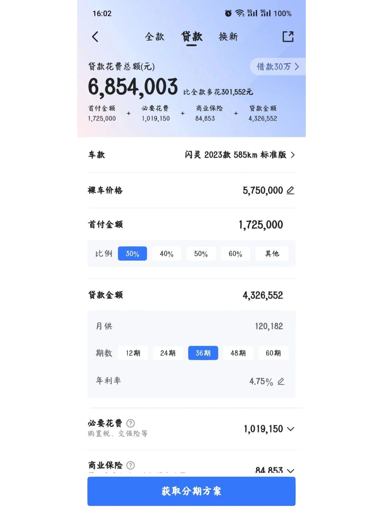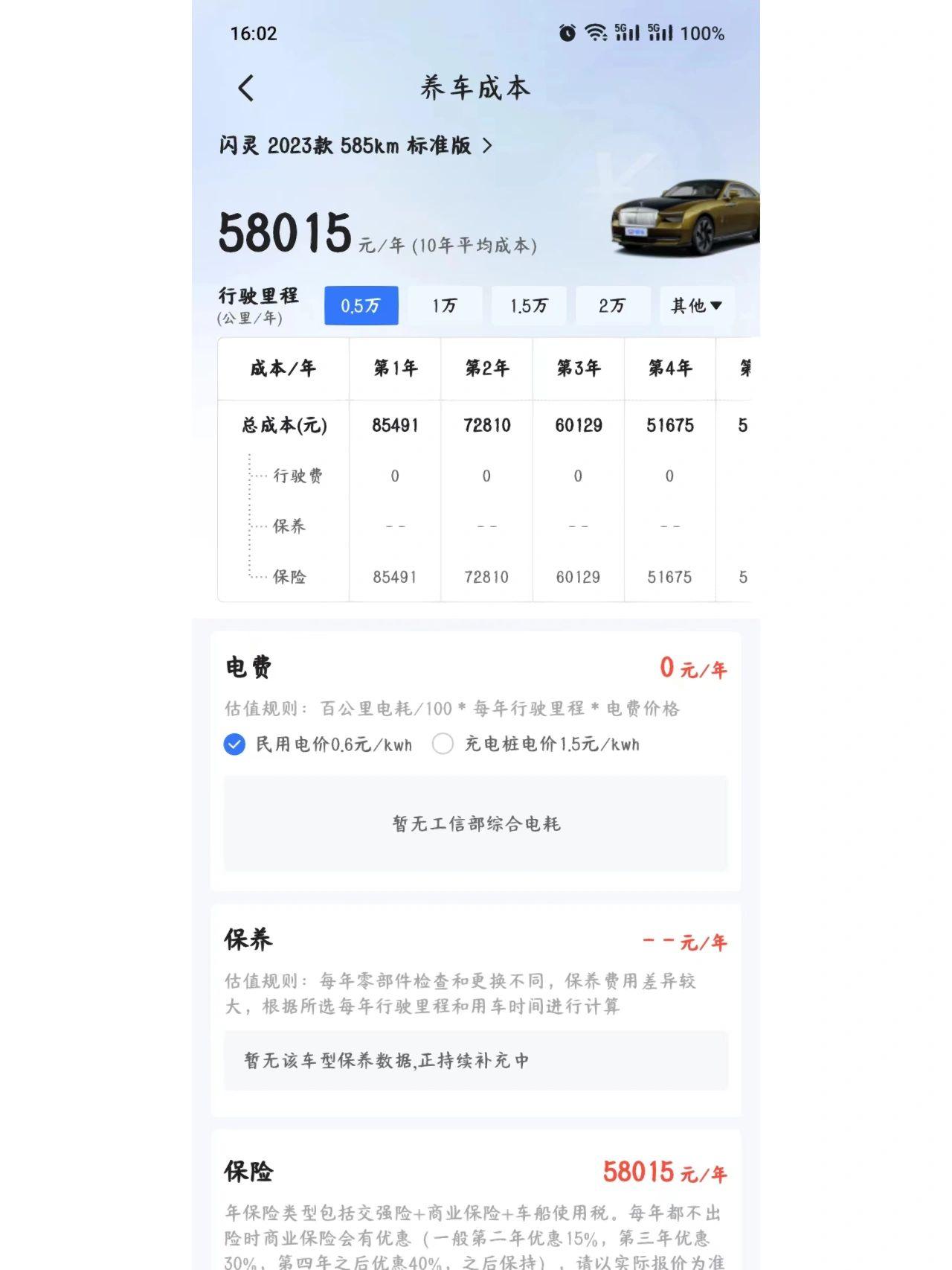 假如你有800w,你会选择劳斯莱斯闪灵吗? 宝子们最近都有关注上海车展吗?实不相瞒一眼就被劳斯莱斯闪灵吸引了目光!在这次上海车展中,劳斯莱斯首款纯电动车闪灵中国首发,新车起售价为575万元,已经开始接受国内的宝子预订啦!不知道屏幕前的小伙伴会不会好奇,要月入多少个w才能买上这辆新款劳斯莱斯呢? 车型:闪灵 2023款 585km 标准版,裸车价:575.00万起 当全款买车又显示银行卡余额不足怎么办?别急,如果贷款买车,首付的金额咱按30%去算就是1725000元,超级豪华车即便是新能源车也需要缴纳购置税508850元,免车船使用税,另外咱要交1100块的交强险,噢别忘记还有500块上牌费,所以就单单首付和一些必要花费一次性大约就需要给2744150元,按分3年期年利率4.75%去算,每个月月供还需要120182元。 能开上劳斯莱斯闪灵的大佬估计不会在乎用车成本,咱忽略用车所花的电费,只算上平均每个月4835元的险费,对比车价,用车成本反倒是笔“便宜”的开销~ 按这么来算的话,买一台劳斯莱斯闪灵一个月就大概要花125017元,而这些还是按照最省成本的标准来算的,还有很多隐性的花费,比如停车费啊、违章啊、保养费这些啦...... 为了不影响生活品质,车贷最好不要超过月收入的三分之一,也就是说月入37个w左右的人,才能开得起并养得起这辆尊贵梦中情车,小伙伴们有兴趣吗?我已经钻进被窝里,准备找周公借一辆来开啦~我看到已经有大佬下订啦,听说落地要800+,真的羡慕绝了!