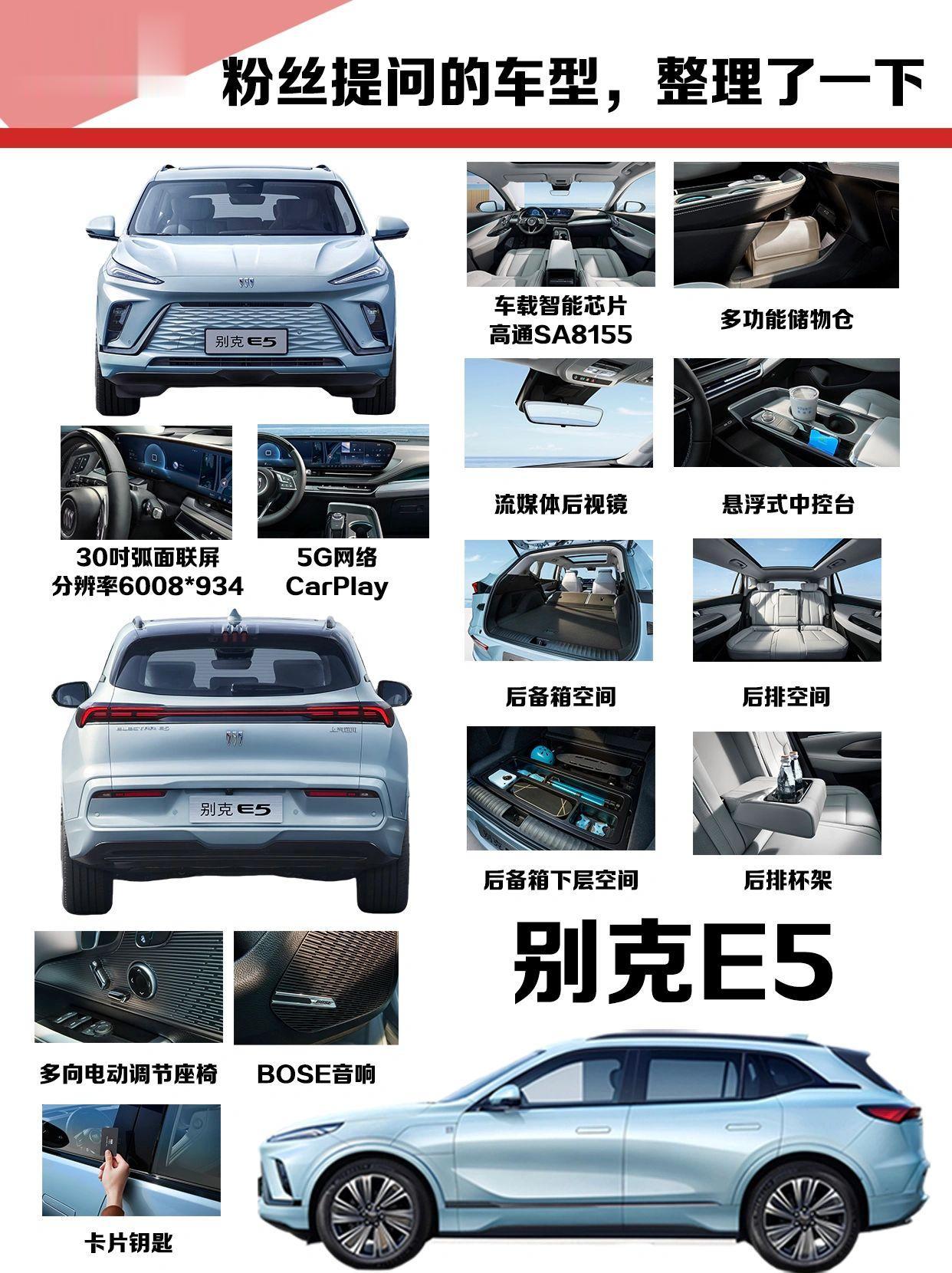 20万左右,适合女生开的高颜值纯电SUV 别克E5刚上市,有不错的优惠,例如整车终身质保、免费家充+安装+置换礼,还可以定制车身等等 别克E5的外观有未来感,颜值很高,而且是跟凯迪拉克锐歌同平台(奥特能),连30吋的曲面连屏也有搭载。 别克算有大厂底蕴的品牌,有保障,不会一夜之间“糊”了 本来看的特斯拉,但是配置和内饰过于简洁,不喜欢那样的风格 空间很大,包括悬浮式中控区可以放包包,后备箱很大,座椅支持独立放倒,而且还有一个下层储物空间(别克E5的空间表现确实不错,在同级也算得上优秀)。