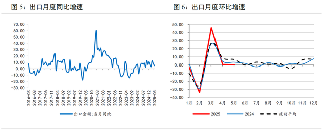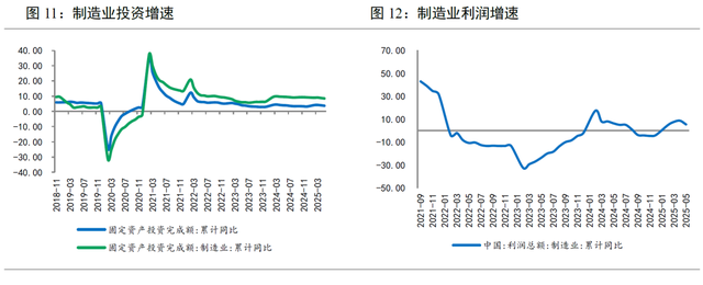 但随着关税扰动逐渐显现,二季度出口增速开始放缓。4月、5月出口分别同比增长8.1%和4.8%,呈回落态势。其中对美出口降幅连续扩大,美国占我国出口比重已降至有统计以来最低水平。受出口拖累,5月工业增加值同比增速放缓0.3个百分点至5.8%,为年内最低水平;1-5月制造业投资同比增长8.5%,较1-4月放缓0.3个百分点,降至2024年初以来最低水平。