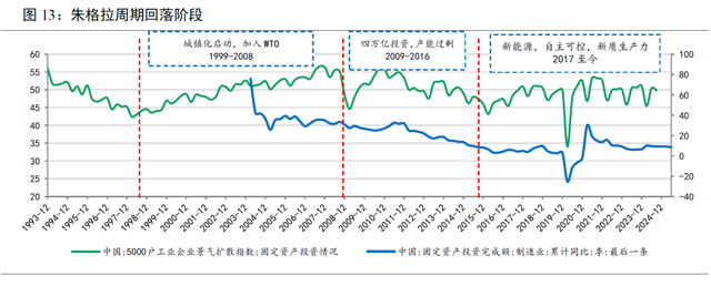 从周期角度看,当前正处于第三轮“朱格拉周期”的末尾阶段。按“5000户工业企业景气扩散指数:固定资产投资”指标来看,本轮周期约从2017年开始,以“新能源”“自主可控”“新质生产力”等为主题,期间虽然受到疫情冲击,但企业投资意愿始终保持在较高水平,投资增速也维持在8.0%以上,持续高于疫情之前水平。但随着“内卷式”竞争加剧和盈利水平下降,本轮周期或已临近尾声。