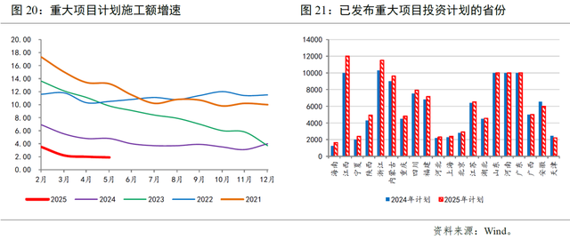 上半年基建投资走势相对强劲。1-5月狭义基建投资同比增长5.6%,高于去年全年的4.4%,继续发挥托底作用。根据部分省份年初发布的重大项目投资计划来看,今年重大项目投资规模较上年增长5.0%左右,与基建投资增速大体相当。