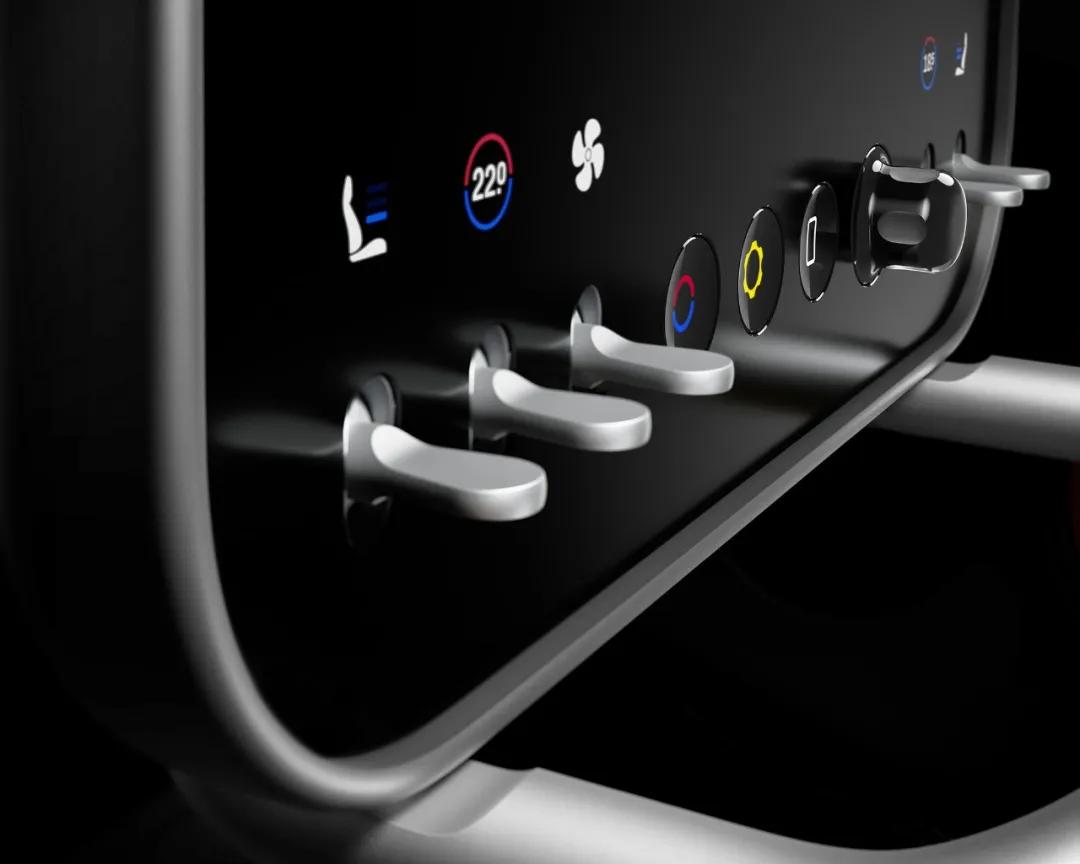 仪表盘由两块超薄的OLED屏叠加而成,中间是三圆式信息屏,每个圆上覆以玻璃镜片,还饰以阳极氧化铝环形饰件。尽管是数字信息,仍然立体感十足。法拉利Luce一共有三块显示屏,除了仪表屏,后排还有一块控制屏,而最具巧思的则是前排中间的控制面板。