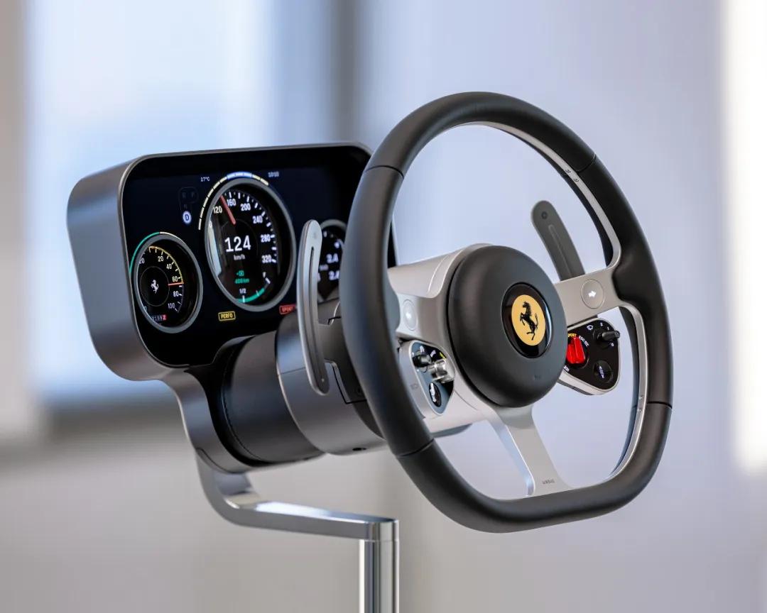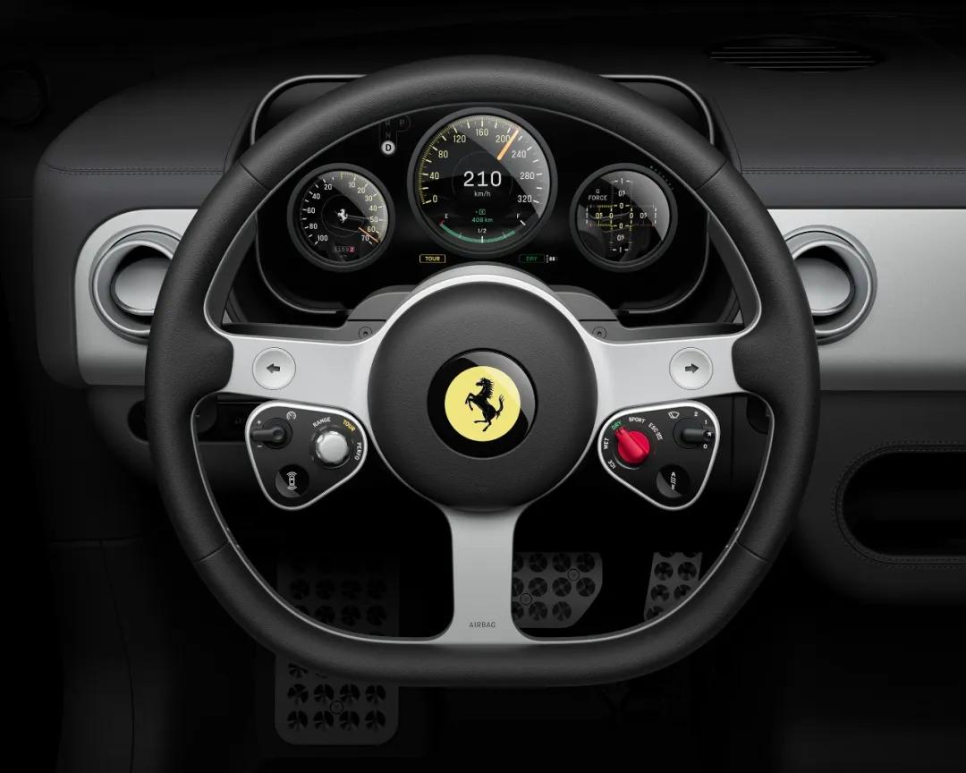 方向盘采用致敬经典的三辐式造型,上面的铝合金辐条采用外露式设计,两个三角形的功能控制区域布置在其中,功能的操作清晰分明,其设计借鉴了F1赛车的理念。法拉利首次将仪表屏集成在转向柱上,可以随着方向盘的角度调整、上下伸缩同步移动,这样有利于直观读取信息,提升了驾驶专注度。
