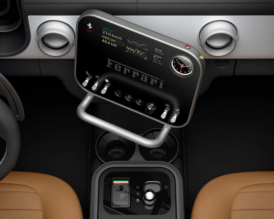 我们现在通常把新车的中间大触控屏叫中控屏,而法拉利Luce中间的屏幕集成了信息显示、物理按键(拨杆)和一块圆形表盘,所以控制面板是更准确的称呼。这块方形控制面板置于铝合金承托支架上,后面有一个可多向转动的球窝接头,使屏幕能自由转向驾驶者或者副驾一侧。