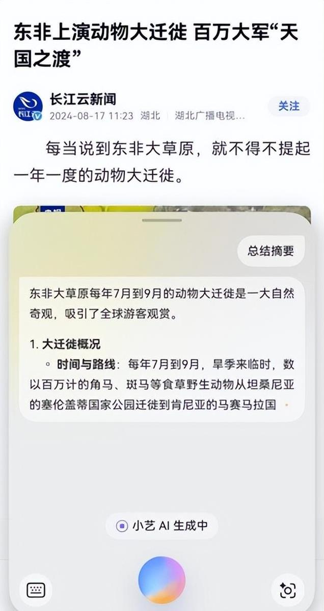 比如,当你正在阅读一篇关于东非动物大迁徙的长文时,想要快速了解文章的核心观点,只需长按导航条唤醒小艺,选择“总结摘要”,小艺就能迅速识别并理解屏幕上的文章内容,为你生成精炼的摘要,更加高效地获取信息。