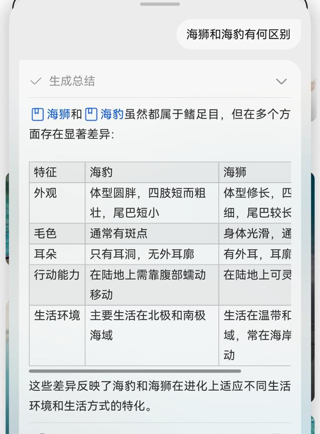 当你带着孩子在动物园里游玩,孩子好奇地指着一只海狮问:“爸爸,那是海豹吗?”这时,你只需要拿出手机拍摄一下,然后用指关节圈选,点击“问问小艺”,小艺就能迅速识别并给出准确解答:“这是海狮……”,你还可以继续追问“海狮和海豹有啥区别”,小艺会给你提供一个表格,清楚展示海狮和海豹的区别。如此专业且及时的科普,让孩子在游玩中也能学到新知识,真是寓教于乐。