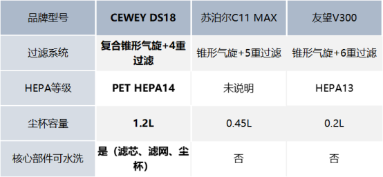 从过滤配置来看,CEWEY DS18表现更为全面。搭载高等级HEPA滤网与复合锥形气旋结构,能有效拦截微尘、保持排风洁净,避免二次污染;1.2L大尘杯减少清理频率,滤网支持水洗,维护也更省心。