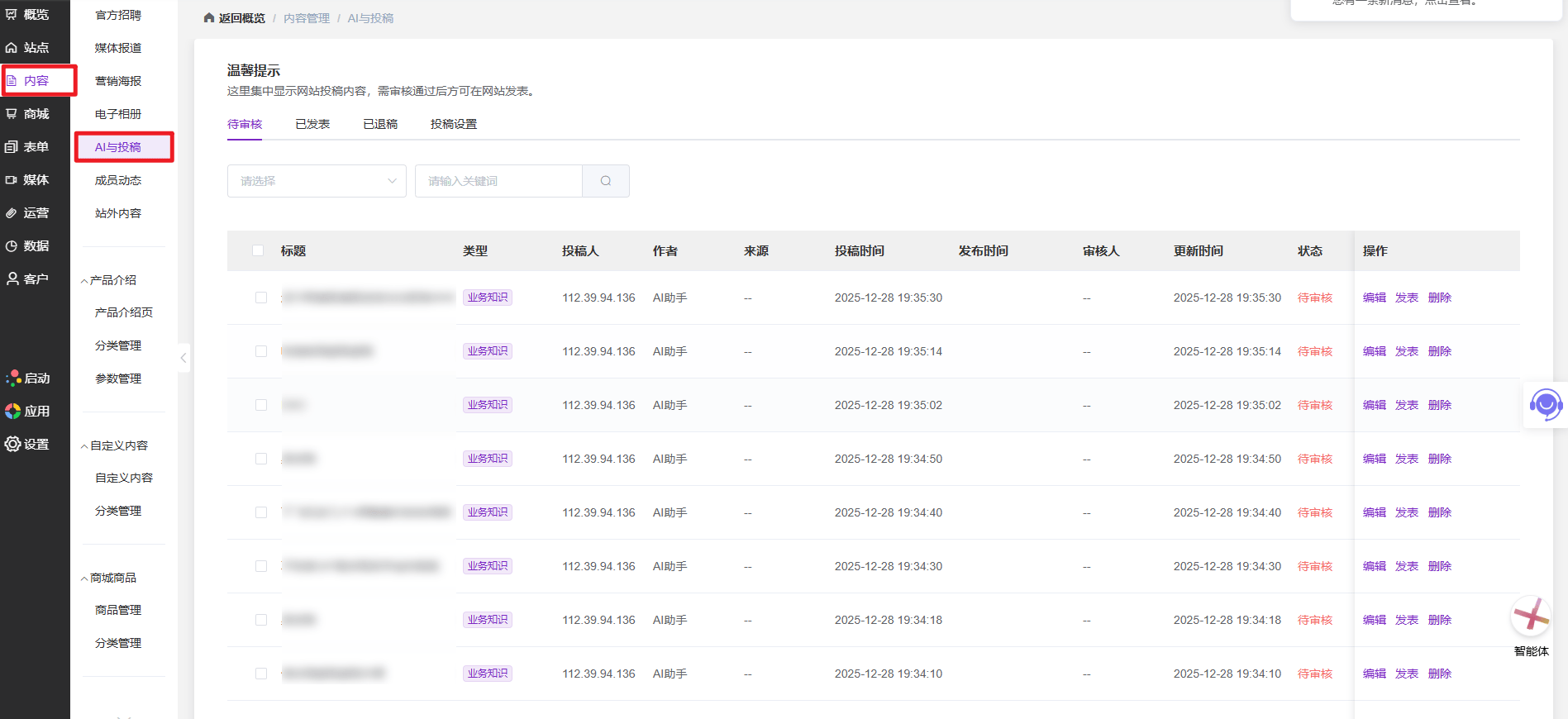 列表会展示标题、类型、投稿人、作者、投稿时间、状态等信息,点“编辑”即可查看详情,实现人工追溯与复盘。