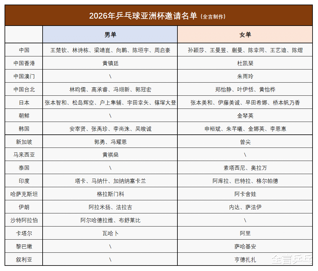 2026年乒乓球亚洲杯即将在中国海口开打,北京时间2025年12月26日,国际乒联公布首批邀请名单,其中国乒多达12人上榜,日本9人、韩国8人入围,不过该名单并不代表参赛阵容,只是根据相关规则自动生成而已——更多详情请看下文。