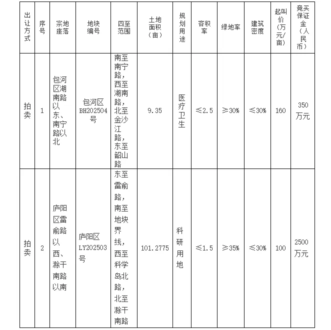 包河区BH202504号地块:位于包河区湖南路以东、南宁路以北,占地面积9.35亩,规划用途为医疗卫生用地,容积率≤2.5。