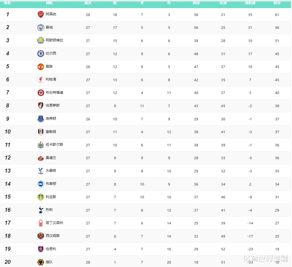 第27轮比赛,维拉1-1战平利兹联,积51分排名第三,落后曼城5分,领先第四和第五的切尔西和曼联5分。