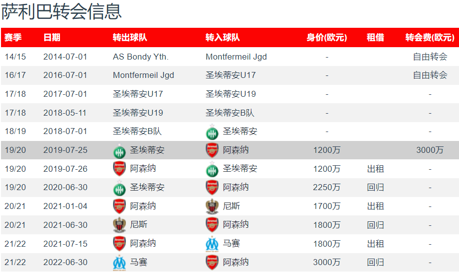 阿森纳于2019年以3000万欧元的转会费从圣埃蒂安签下萨利巴。