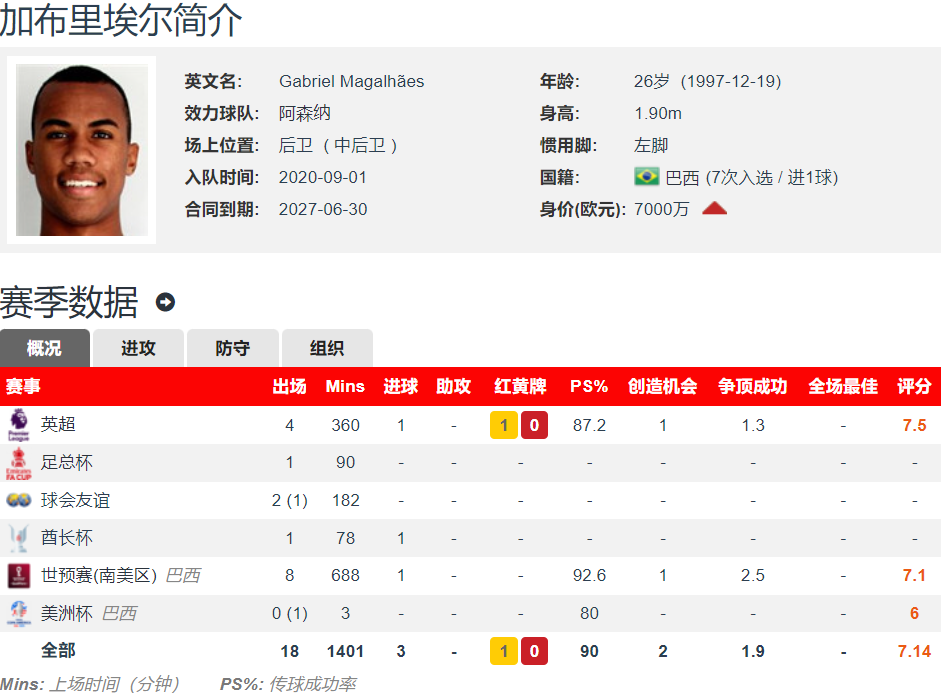现年26岁的加布里埃尔身价已经涨至7000万欧元,身高1.90米,左脚中卫,合同至2027年,真是一笔超级划算的引援。
