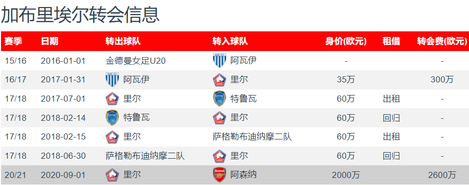 阿森纳于2020年夏窗以2600万欧元的转会费从里尔签下加布里埃尔。