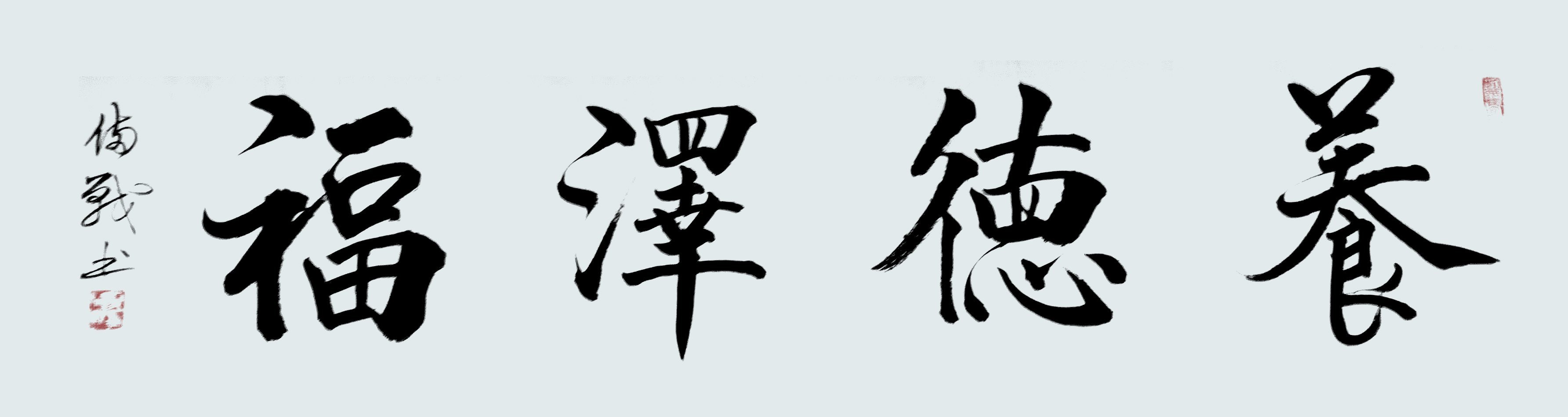 就以他的几幅八字箴言横幅作品来看,书中他所主张的,显然就是“一点成一字之规,一字乃终篇之准”的挥毫之道。用笔时,力道遒健而不失于游动,是谓外有千钧之力,而内有纤巧之韵也。不得不说,夏备战先生是将“正大”与“灵动”结合的十分完美,字字纤锋往来,播布研精,婉时若银钩,源时若惊鸾,既知停匀则求变化,也见斜正疏密错落其间,由此一幅观之,真可谓是书卷气浓。行书笔意兼楷法,清刚雅正自非凡!